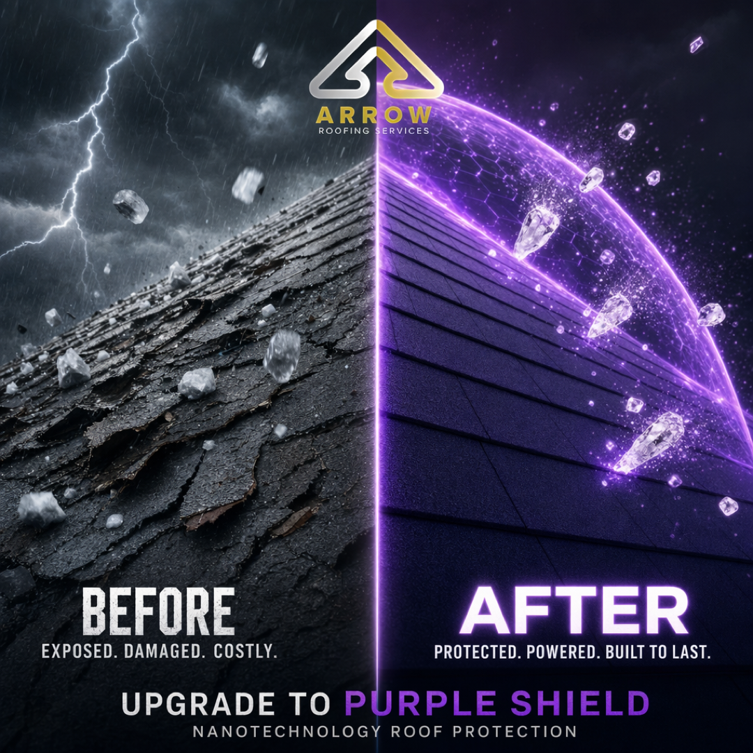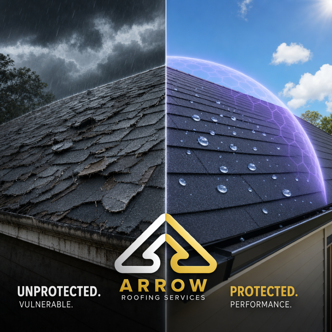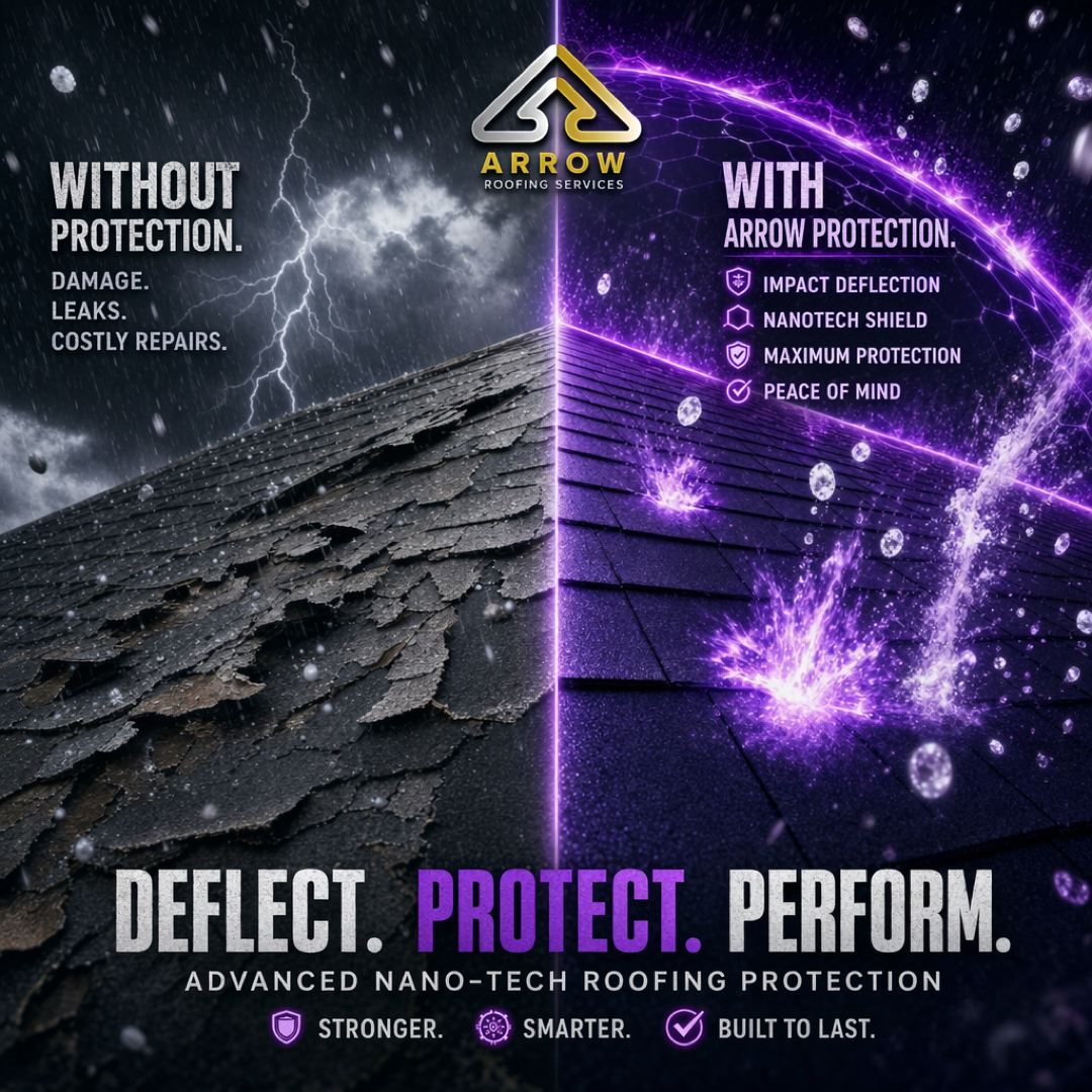GoNano is a nanotechnology shingle treatment Arrow Roofing applies as a Certified Dealer. It bonds with asphalt shingles, seals micro-cracks, locks granules, adds 10 to 15 years of roof life. One day. No tear-off. No mess. Backed by a GoNano warranty.