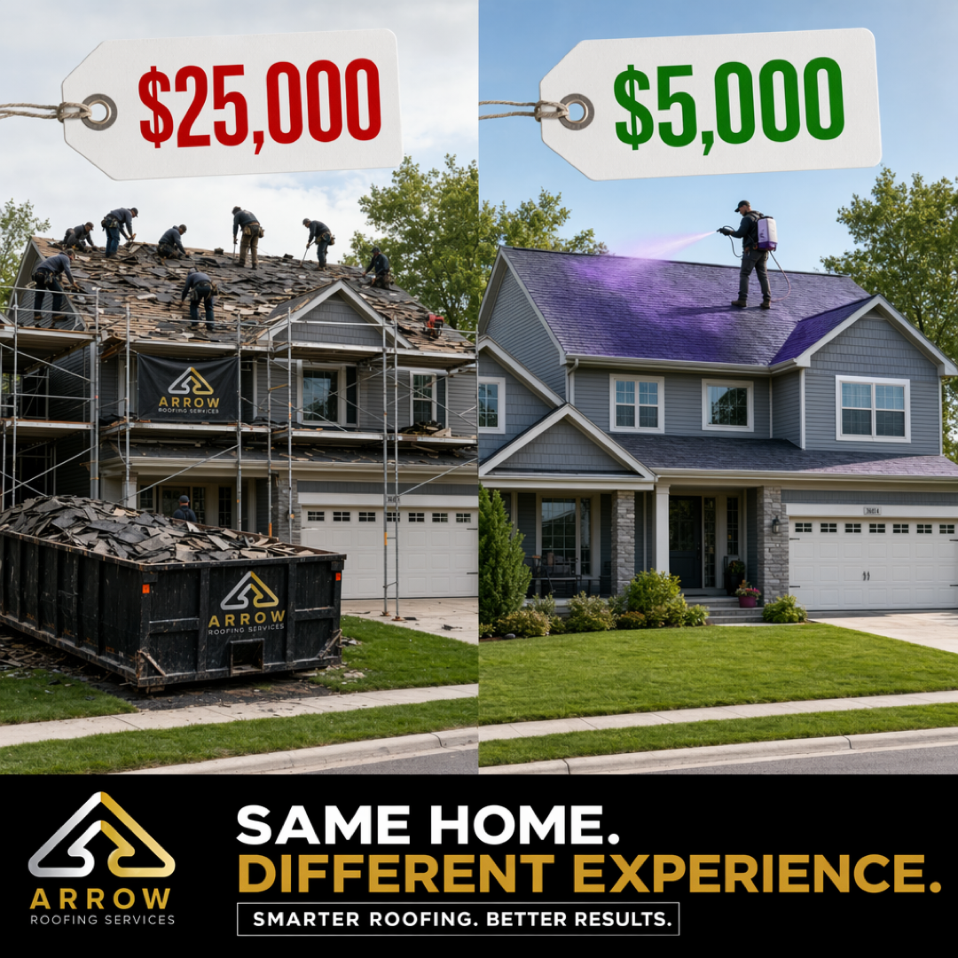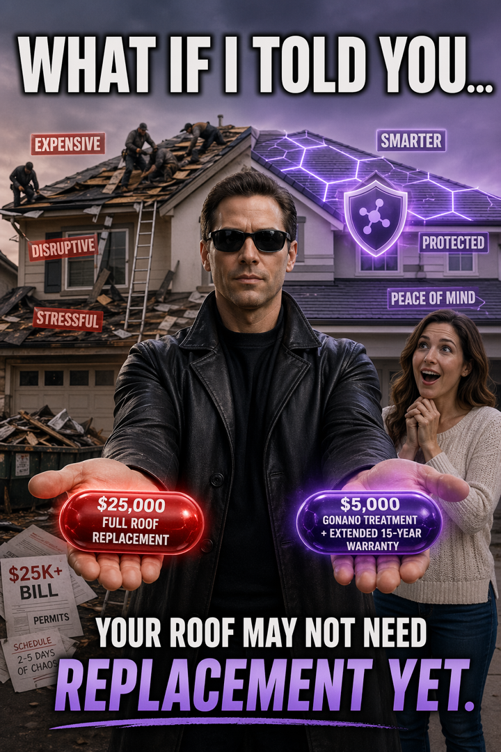 $25,000 to replace your roof. Or $5,000 to extend it 15 years with GoNano. Same outcome. One-day application. No tear-off, no dumpster, no mess. Free roof score, no pressure. (734) 636-2251
